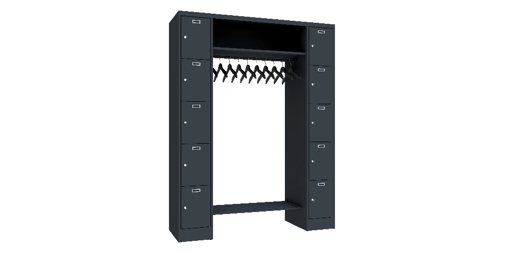 Garderobe, 2 Säulen mit 5 Fächern, 300 mm AB, Hutablage 900 mm, Zyl., RAL 7016