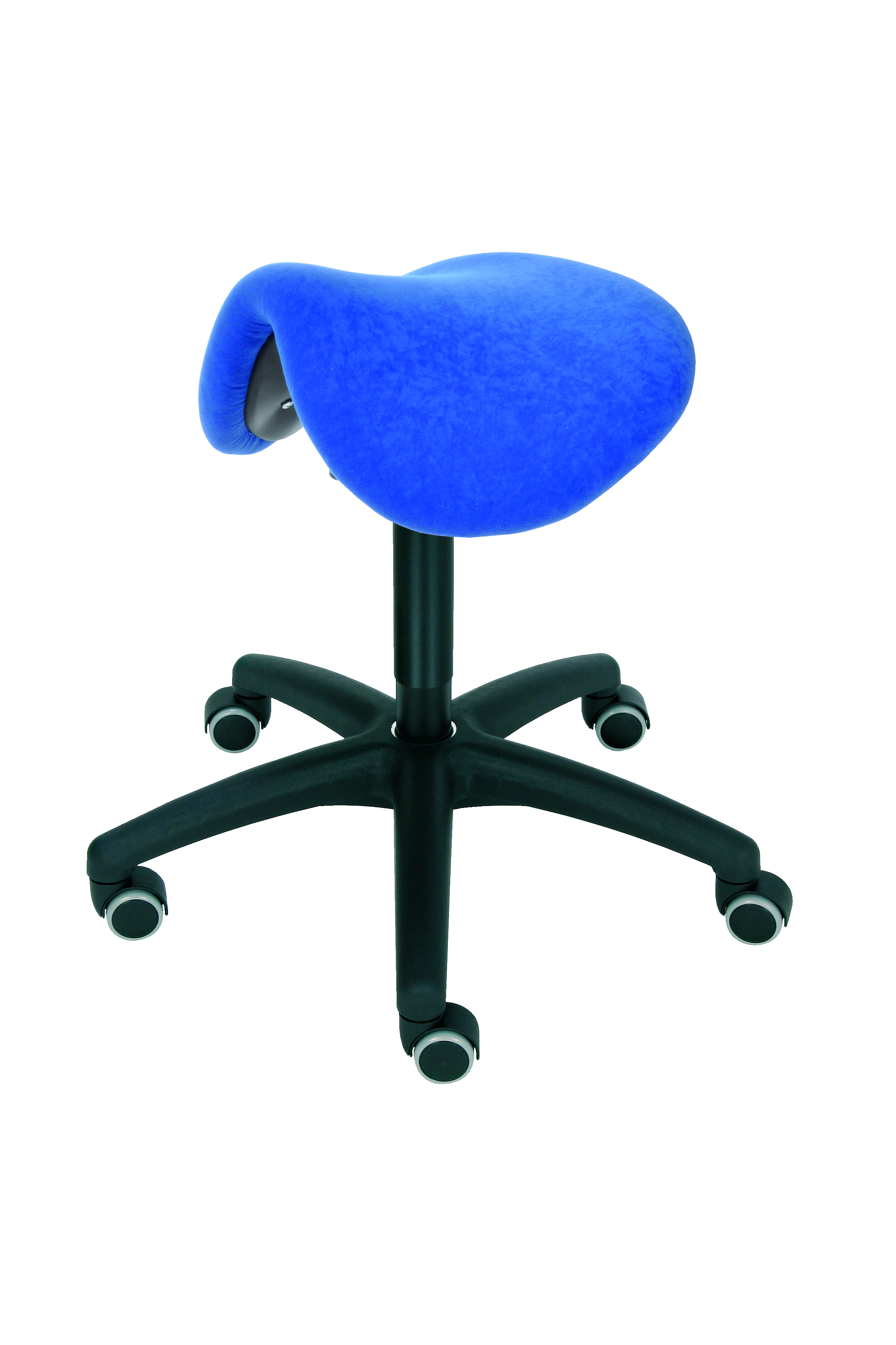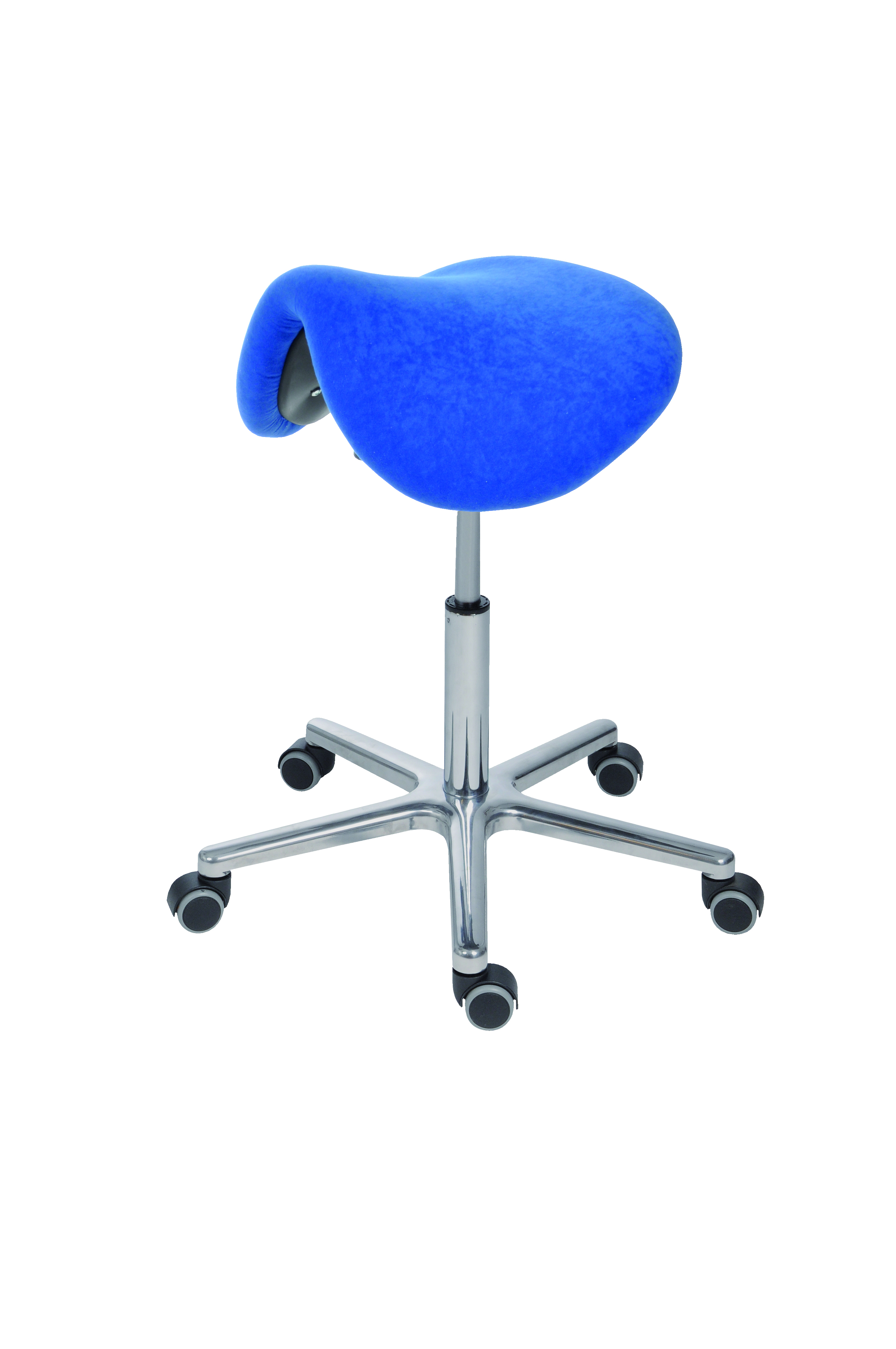 Sattelsitz bewegtes Sitzen; Sitz: Polster, blau, in alle Richtungen beweglich; Sitzhöhenverstellung: