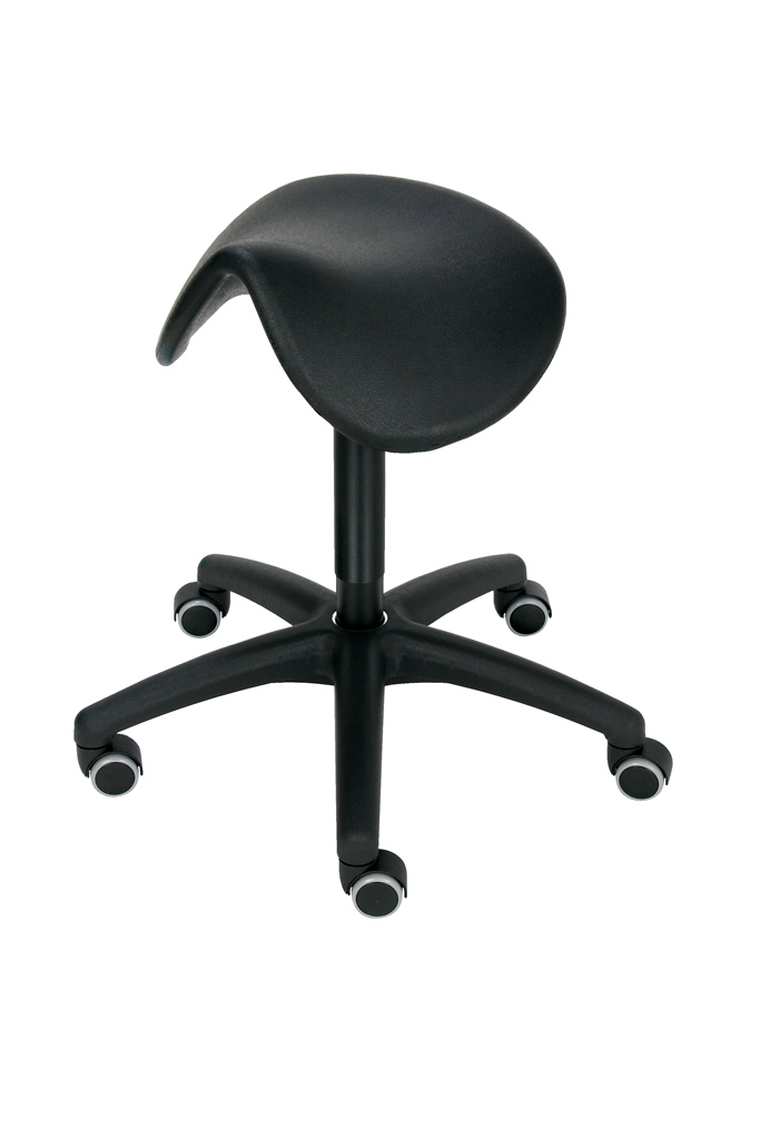 Sattelsitz bewegtes Sitzen; Sitz: Kunstleder, schwarz, in alle Richtungen beweglich; Sitzhöhenverste