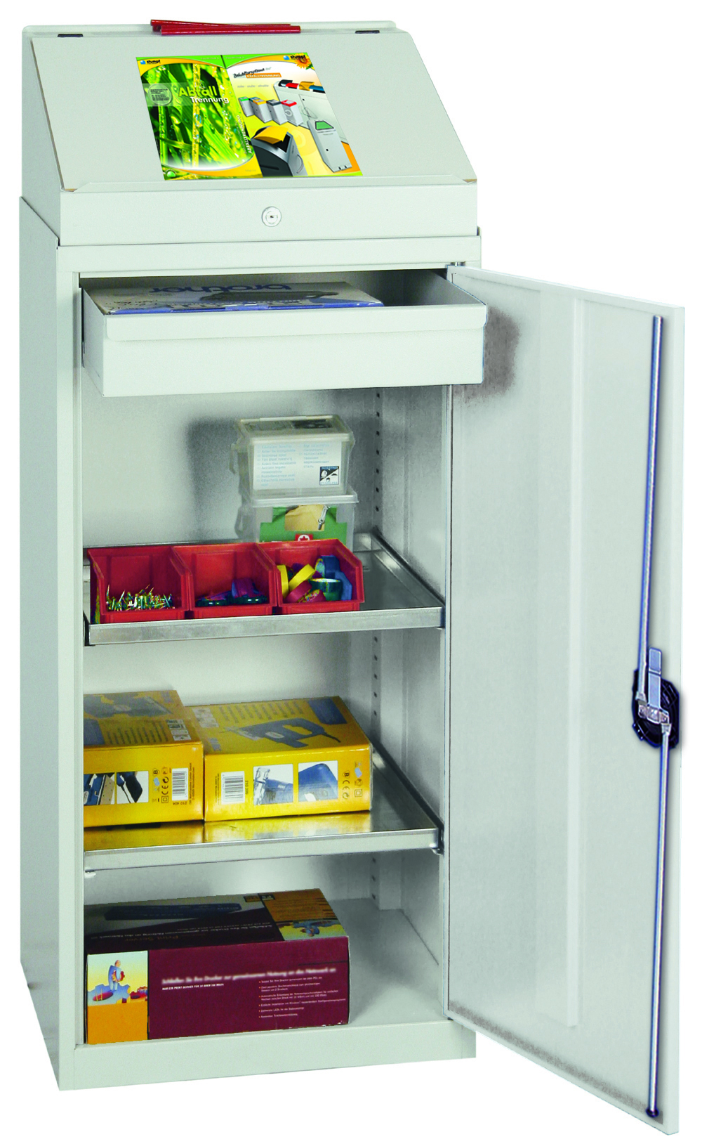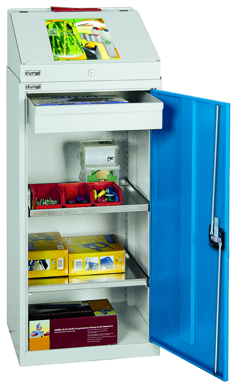 Schrankpult Serie 2000, RAL 7035/5012, 1 Schreibpult, 1 Schublade, 2 Fachböden