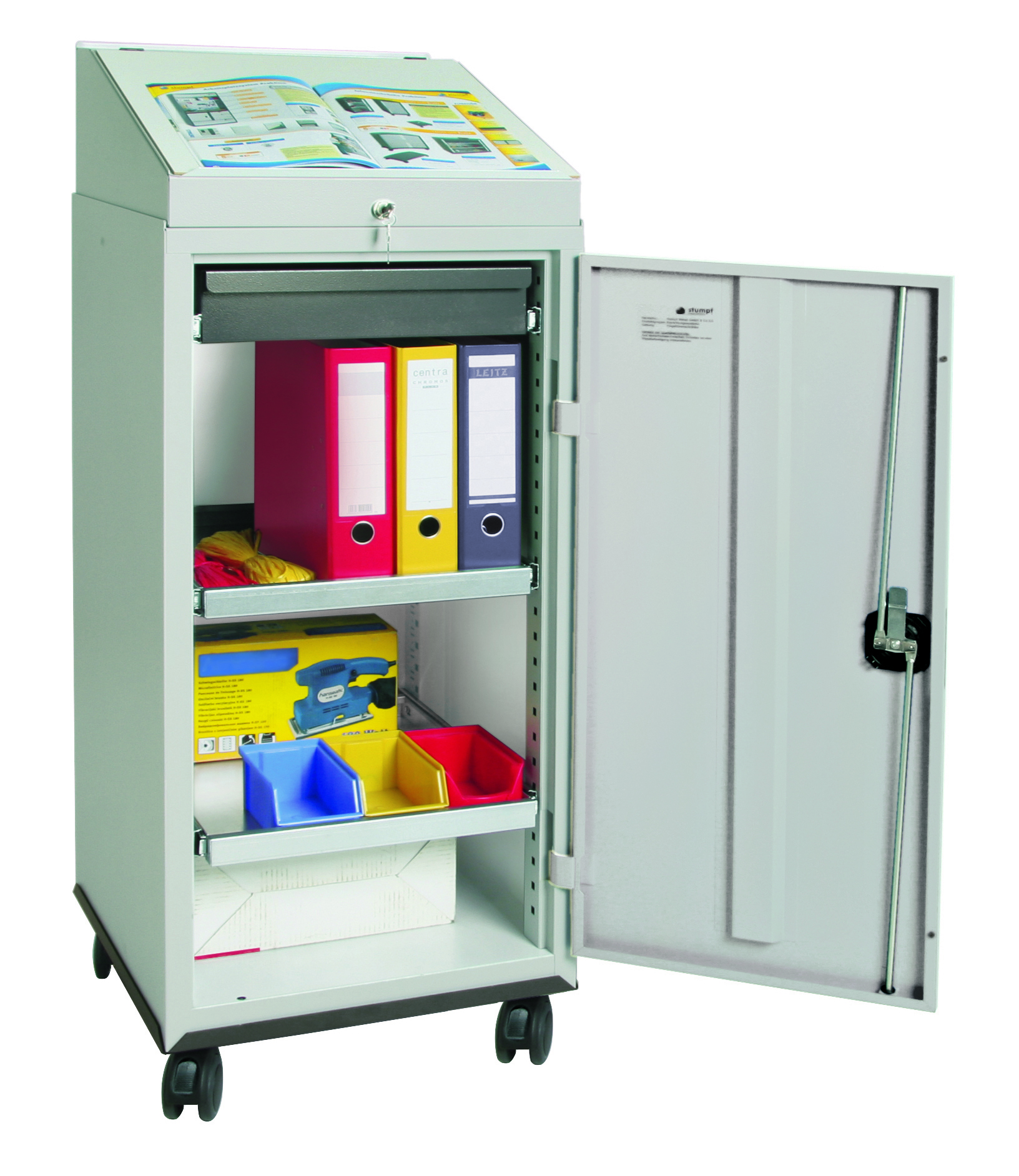 Schrankpult Serie 3000, fahrbar, RAL 7035/5010, 1 Schreibpult, 1 Schublade, 2 Wannenböden, Rollunter