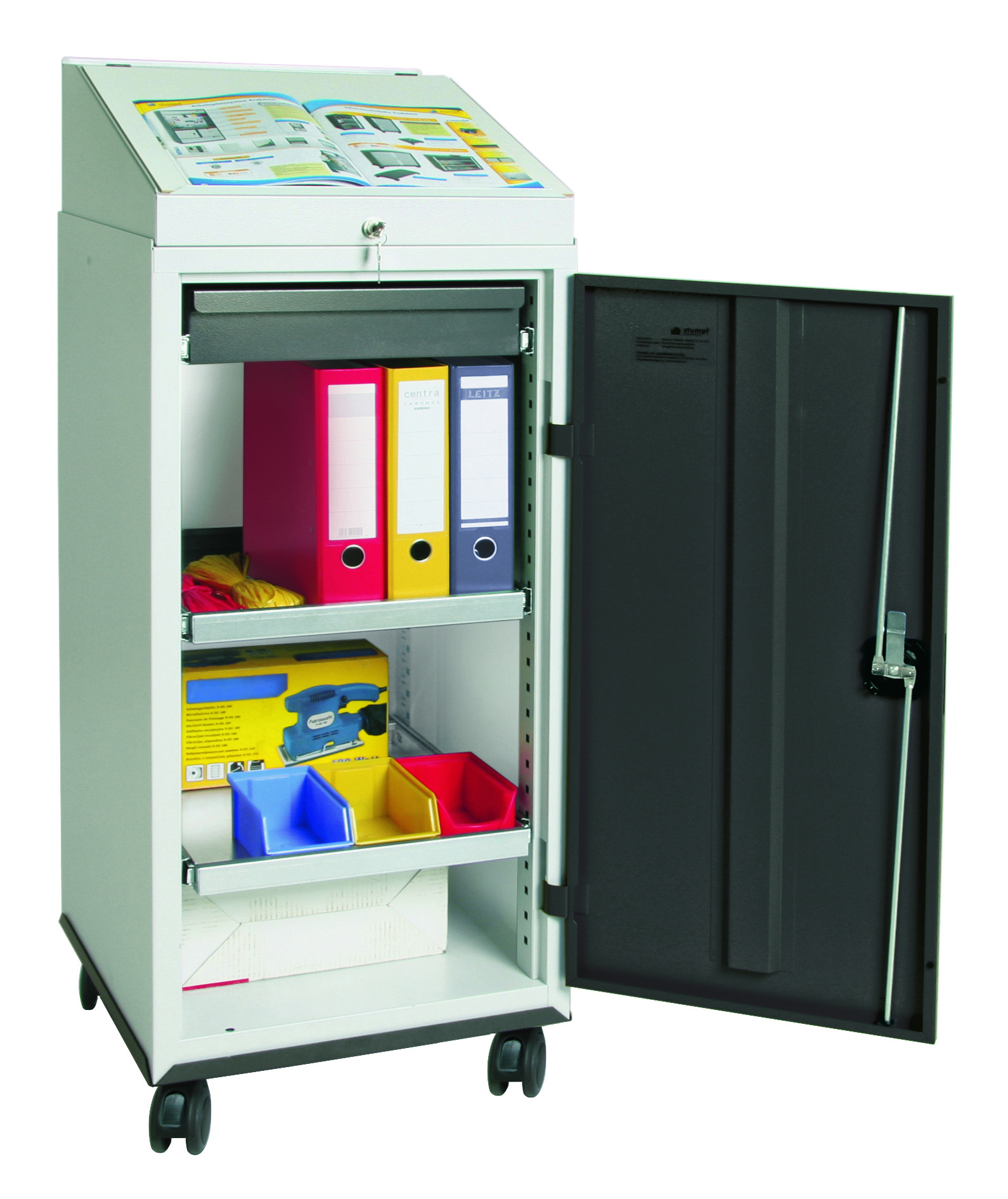 Schrankpult Serie 3000, fahrbar, RAL 7035/7016, 1 Schreibpult, 1 Schublade, 2 Wannenböden, Rollunter
